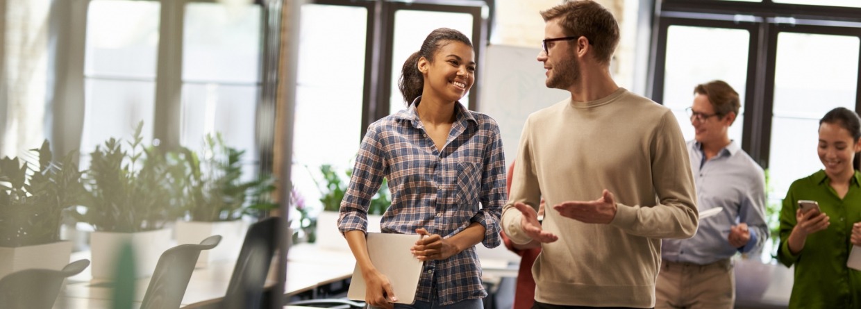 Mannelijke en vrouwelijke collega's praten, bespreken het project en glimlachen terwijl ze door het moderne kantoor lopen